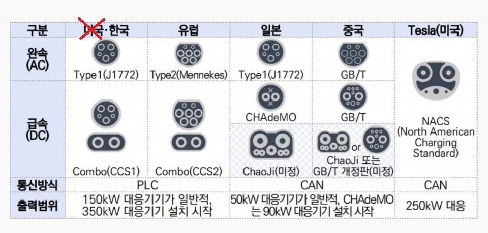 여튼 표준이 확정된 한국은 보조금을 마구 풀며 CCS1 combo 단자가 달린 전기차를 열심히 팔았고, 또 이 규격으로 된 전기차 충전기를 열심히 설치했다.